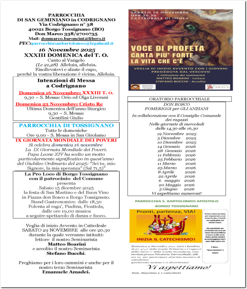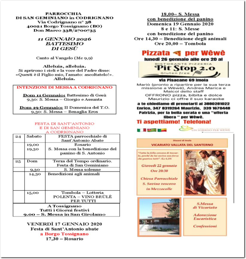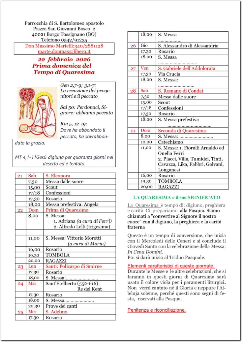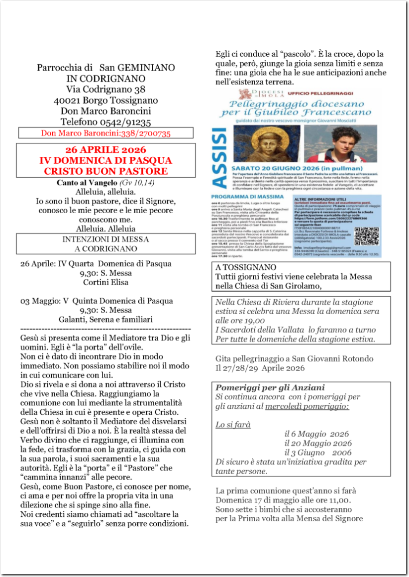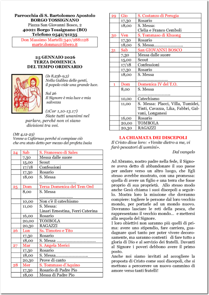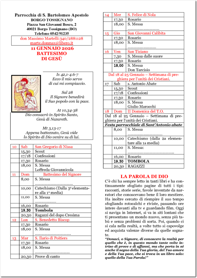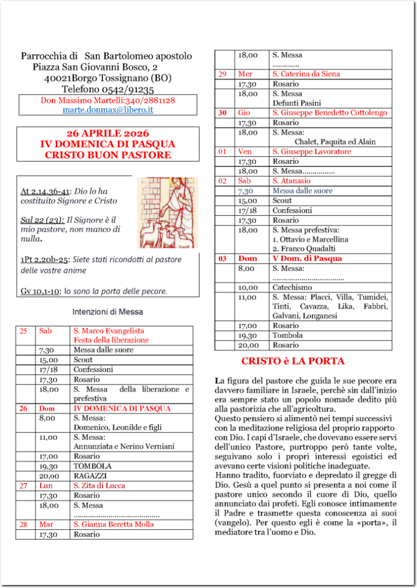 | INCARICHI | ARCIPRETE: Don Massimo Martelli-cell: 340 2881128 EMERITO: Don Marco Baroncini -cell: 338 2700735 |