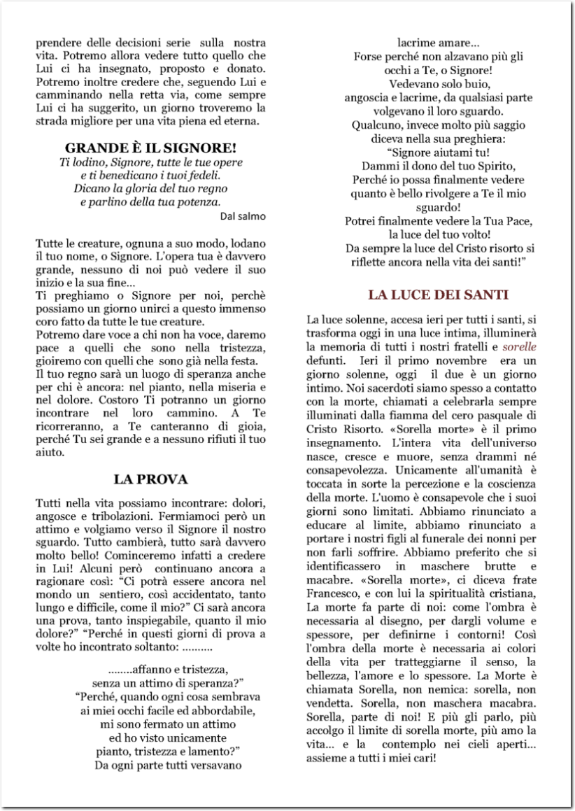 Allora la nostra gioia potrà essere piena. Finalmente vedremo che tutto nella nostra storia aveva un senso, un significato; anche se per un po’ di tempo è rimasto a noi nascosto. Nella tua pace, con gioia e serenità grande, leggeremo quelle pagine, scritte dal Signore, con una chiave nuova… Cristo dalla passione e morte è passato alla gloria nuova, quella dei risorti! Lo Spirito di Dio darà a noi nuova vita, con tanta gioia e una felicità vera.