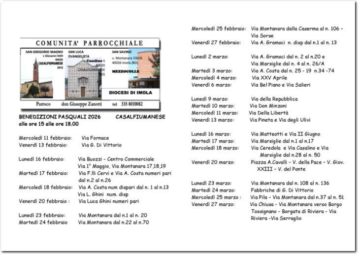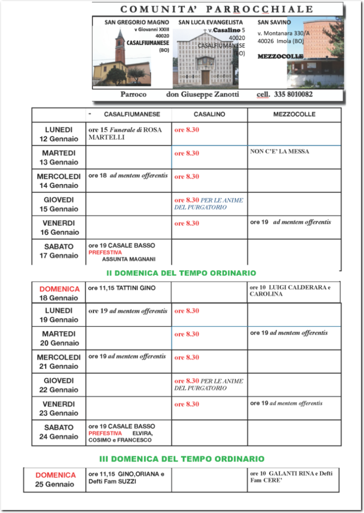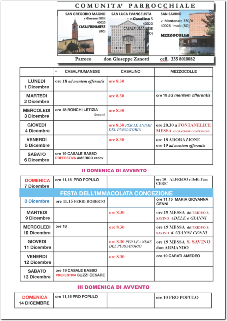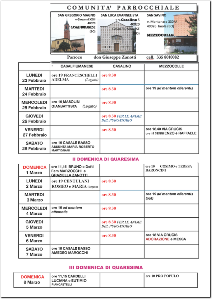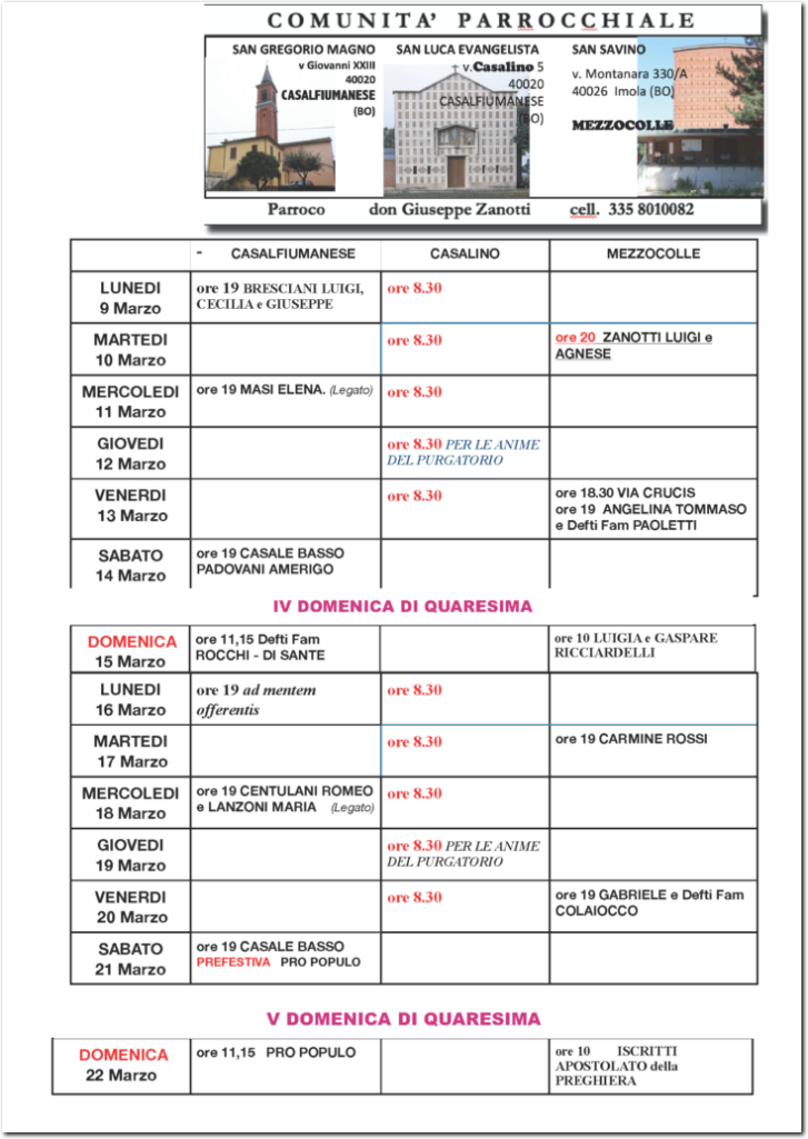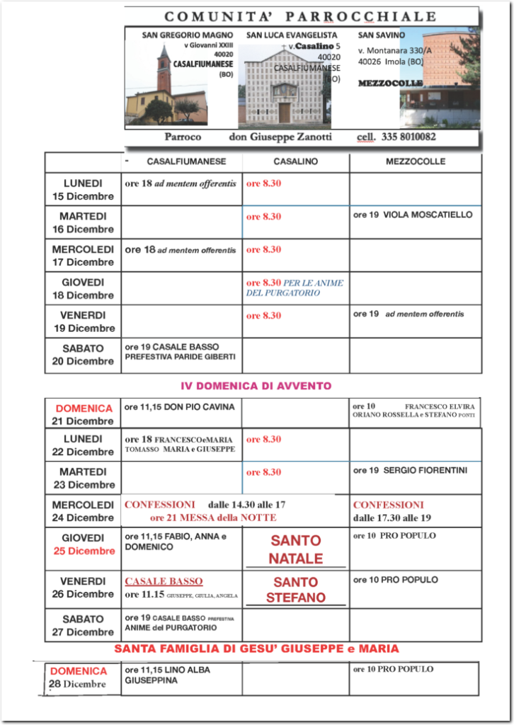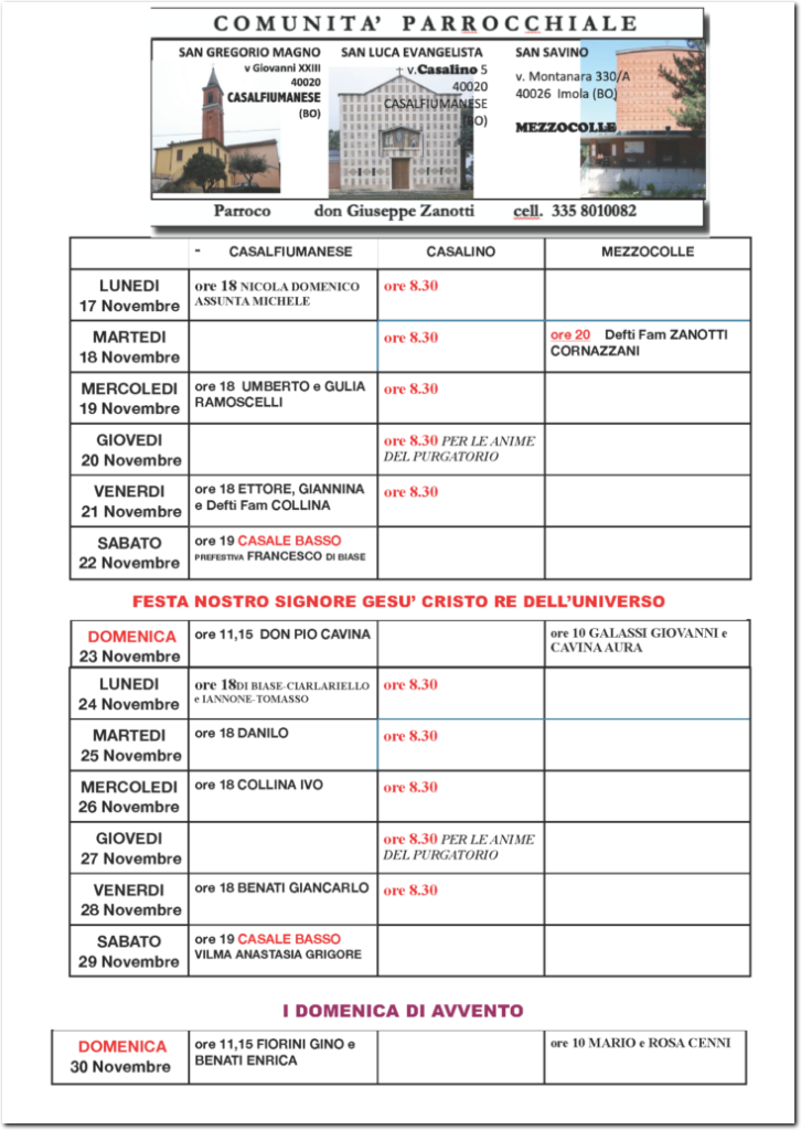 | ORARIO MESSE | FERIALE: dal lunedì al venerdì ore 8,30 PREFESTIVO: ore 19 (da maggio a ottobre) a Borgo Casale (da novembre ad aprile) |