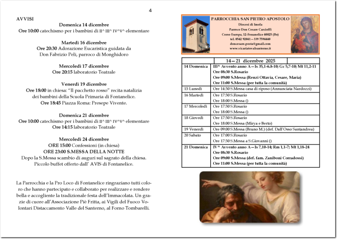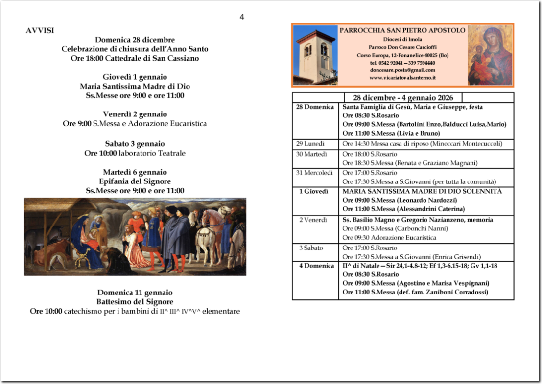 | ORARIO MESSE | FESTIVO:ore 9, ore 11. PREFESTIVO ore 18 (S.Giovanni in Campo). FERIALE ore 9 (solo venerdì), ore 18 (martedì, mercoledì e giovedì) ore 14,30 il lunedì presso la casa di riposo |